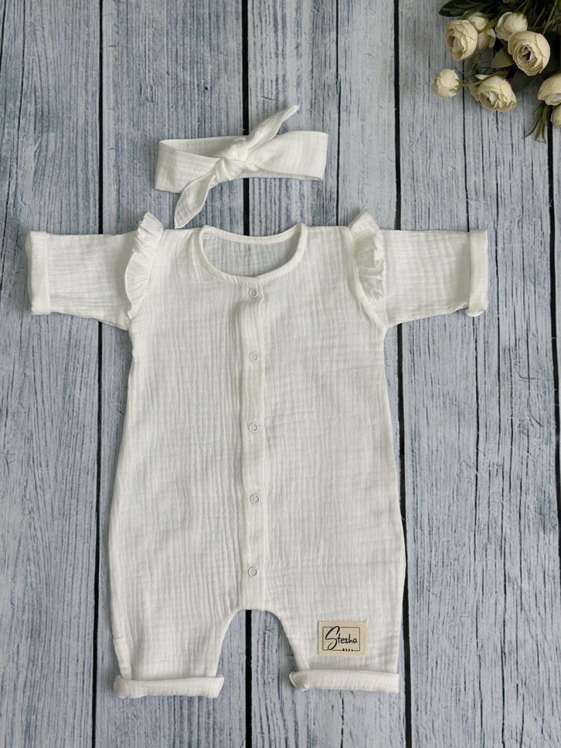 Теги: Купить оптом детский комбинезон . 336-МО. Комбинезон с повязкой для девочки из муслина, хлопок 100%, размеры 56,62,68, молочный цена,отзывы официальный сайт "Стеша Троицк"