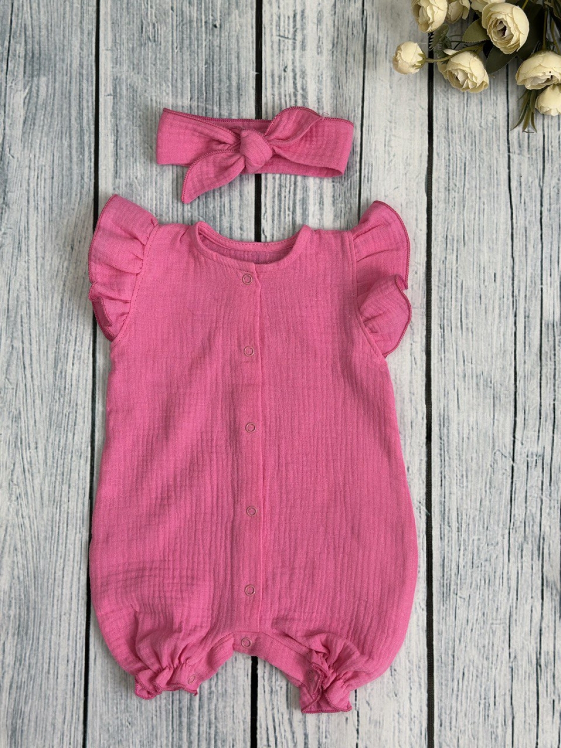 Купить оптом 341-Ф. Песочник с повязкой для девочки из муслина, хлопок 100%, р 62,68,74,80 фуксия в Троицке